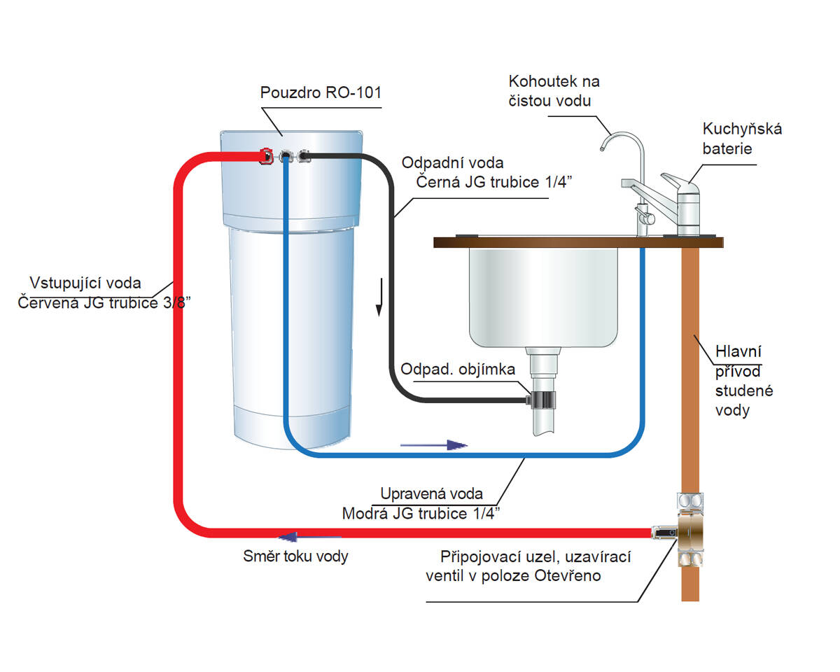 - Samostatný kohútik, ktorý je súčasťou balenia, namontujete na vašu kuchynskú linku. Pokiaľ nechcete vŕtať do linky, je možné dokúpiť si trojcestnú batériu, ktorá nahradí vašu existujúcu.