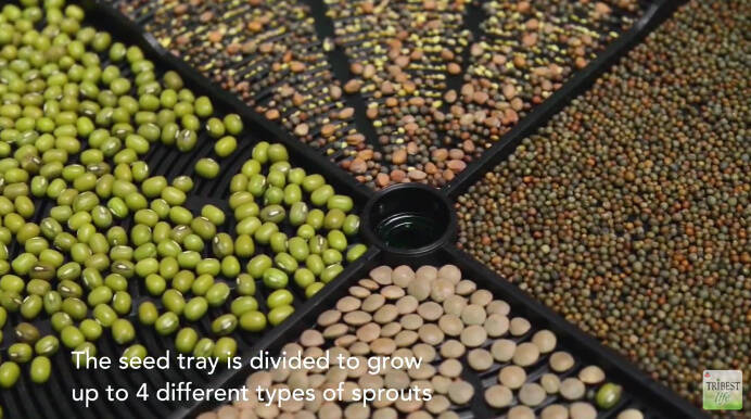 Pred samotným klíčením odporúčame semená či orechy namočiť na niekoľko hodín (viď obrázok nižšie). Po uplynutí odporúčanej doby semená prepláchnite a rozprestrite ich na tácky. Tácky sú rozdelené na štyri sekcie, aby sa vám semená ľahšie oddelili, ak klíčíte viac druhov naraz. Tácka so semenami vložte do nádoby a priklopte vekom. Teraz už stačí automatické klíčidlo zapojiť do siete a zapnúť. Postrekovač bude zvlhčovať klíčky každých 30 minút a na zber sa môžete tešiť po 5-8 dňoch podľa druhu semien.